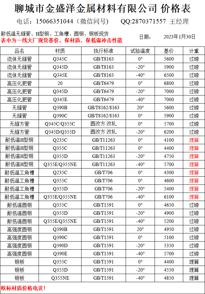 聊城市金盛澤金屬材料有限公司主營低合金/耐低溫無縫管,方矩管,H型鋼,工字鋼,角鋼,槽鋼,圓鋼,鋼板;現(xiàn)貨供應:大無縫、包鋼、煙寶、鳳寶正品耐低溫無縫管,專業(yè)加工生產無縫方矩管;經(jīng)營一線品牌型材:萊鋼/包鋼/馬鋼/日鋼 耐低溫Q235B/C;Q355B/C/D/NE H型鋼(100*100-1000*300) 偏型號H型鋼鋼現(xiàn)貨:250/255,248/124,344/348,394/398,506/201,606/201,458/417,912/302,692/300,792/300 ;萊鋼/馬鋼/宣鋼產 耐低溫槽…
